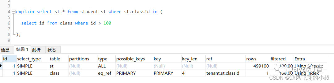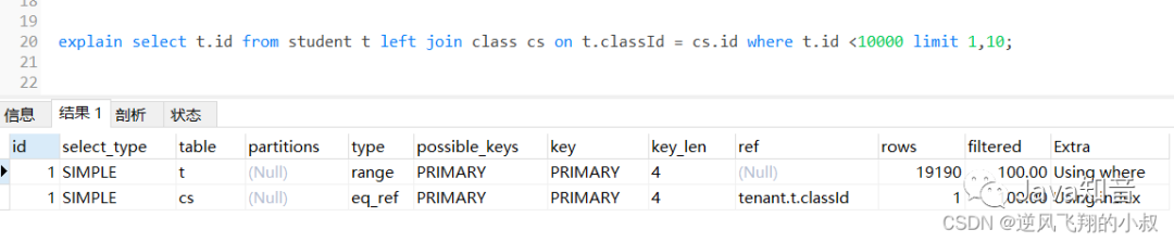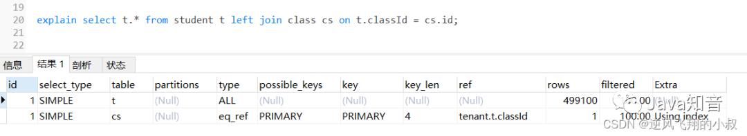 为了检查下sql的执行效率,使用explain做一下分析,可以看到,第一张表即left join左边的表student走了全表扫描,而class表走了主键索引,尽管结果集较大,还是走了索引;