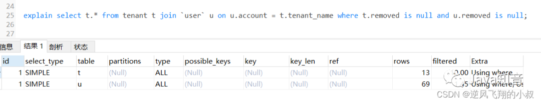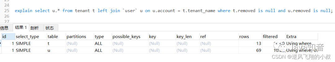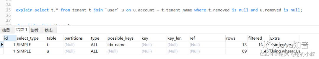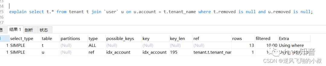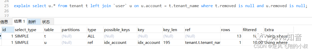 通过explain分析可以发现,左边的表走了全表扫描,可以考虑给左边的表的tenant_name