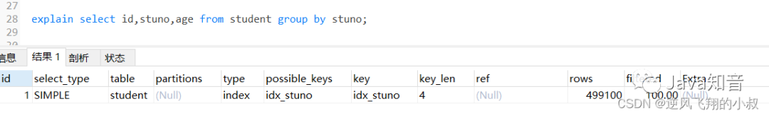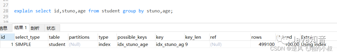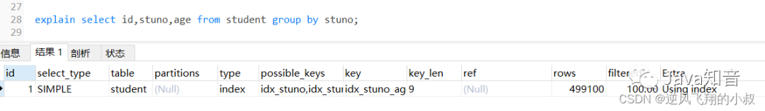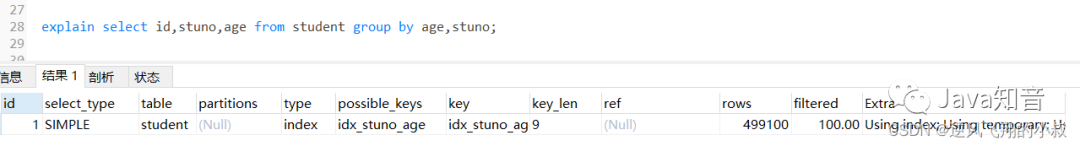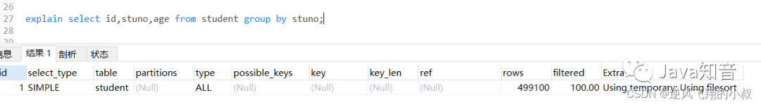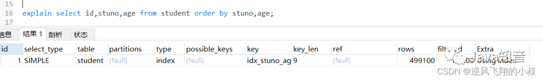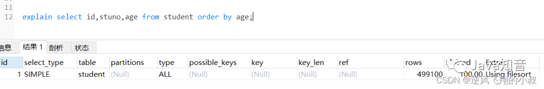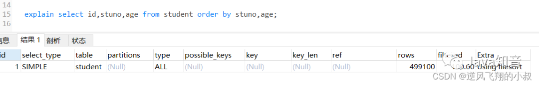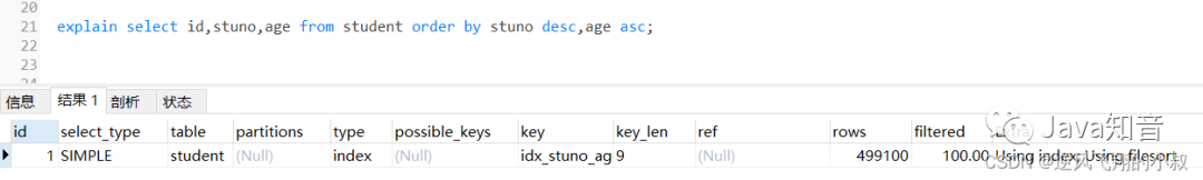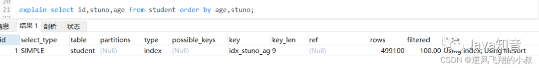 在上面我们创建的联合索引顺序是stuno和age,即stuno在前面,而age在后,如果查询的时候调换排序顺序会怎样呢?通过分析结果发现,走了filesort;