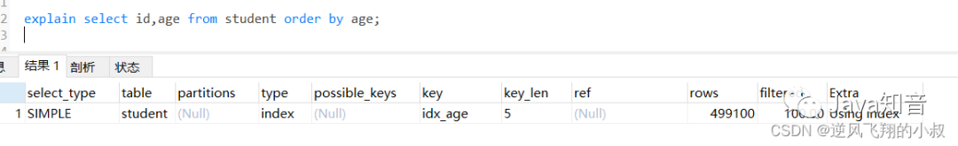 给age字段添加索引,再次使用order by时就走了索引;
