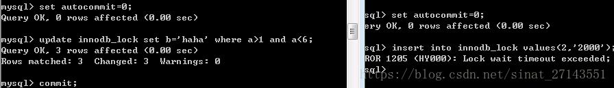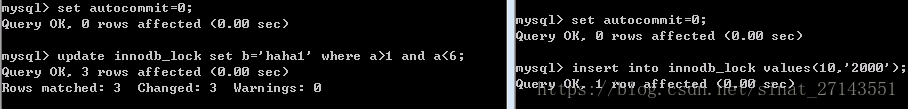 (2)开启事务,在左侧客户端批量修改a为1~6范围内的数据。在右侧客户端插入a为2的数据。右侧操作被阻塞。说明有间隙锁。