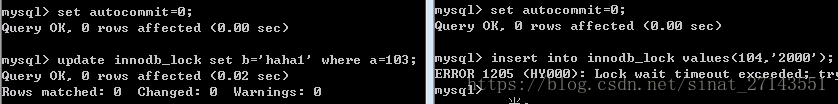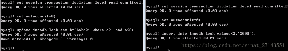 ,重复步骤(2),发现右侧客户端的操作成功,说明该隔离级别无间隙锁。