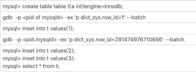 可见,在我用gdb将dict_sys.row_id设置为2^48之后,再插入a=2会出现在表t的第一行,因为该值的row_id=0。