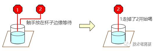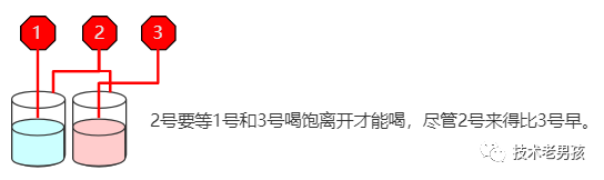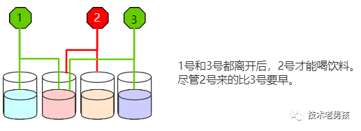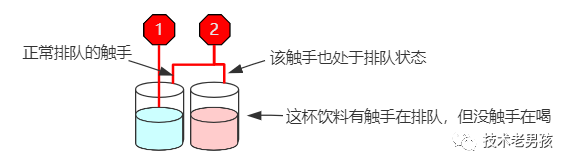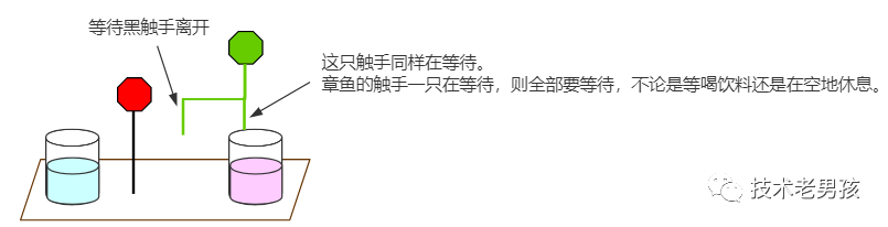 也就是说,如果红章鱼的某只触手在排队,那么它的其它触手也必须排队,即使是没人喝的饮料也要排队。