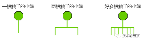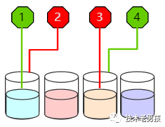 根据以上规则,红章鱼和绿章鱼可以组成很多状态。下面就是一种,编号表示他们来的顺序。