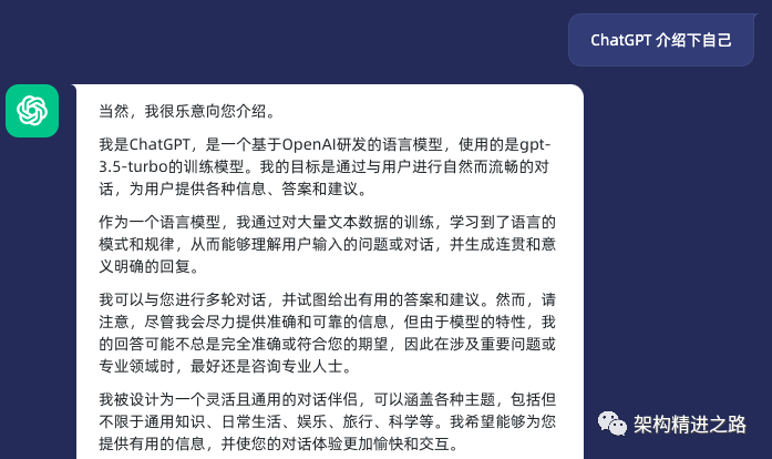 值得一提的是,ChatGPT并非完全人工智能,它是基于预训练的模型,不能具备真正的理解和思考能力。它的回答是基于所训练的数据和模式匹配,可能存在一定的偏见和限制。因此,用户在与ChatGPT交流时应保持批判性思维,并注意判断回答的准确性和可靠性。