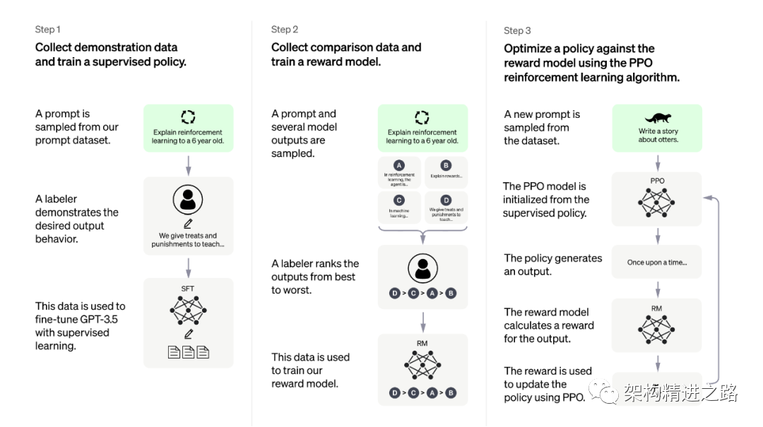 预训练一个语言模型LM; 收集数据并训练一个奖励模型; 利用强化学习微调语言模型LM。