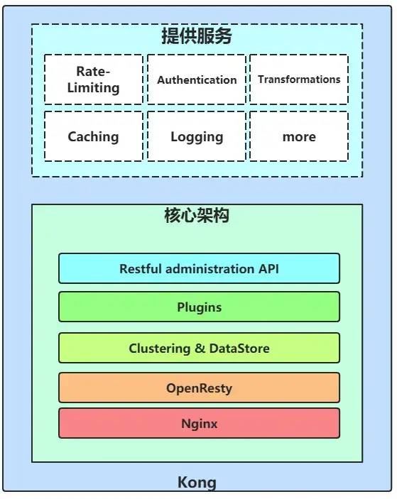 首先最底层是基于Nginx, Nginx是高性能的基础层, 一个良好的负载均衡、反向代理器,然后在此基础上增加Lua脚本库,形成了OpenResty,拦截请求, 响应生命周期,可以通过Lua编写脚本,所以插件比较丰富。