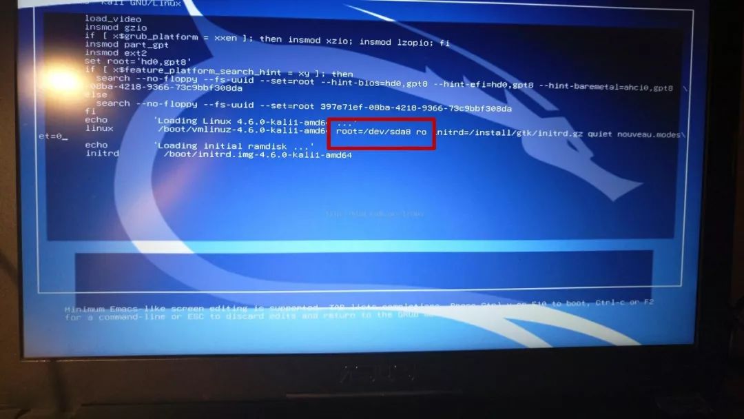 2、启动机器,在机器进入GRUB界面的时候,按下e键,在倒数第三行左右,找到root=/dev/sda8 ro 。