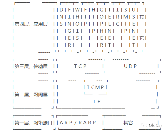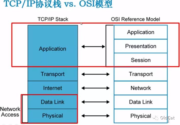 TCP/IP协议栈实际上就是简化的OSI模型,OSI模型有七层,而TCP/IP协议只有四层,TCP/IP协议中将OSI协议中的应用层、表示层、会话层集成了应用层。