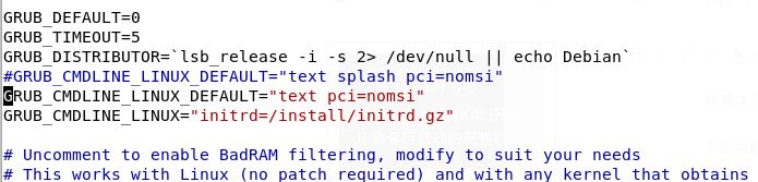 哎,还真行,成功进入系统,为了防止下次开机再次出现类似的错误,便将grub文件中的text后面也加上了pci=nomsi,最终修改结果如下。