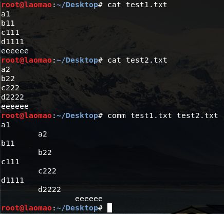 这项指令会一列列地比较两个已排序文件的差异,并将其结果显示出来,如果没有指定任何参数,则会把结果分成3行显示:第1行仅是在第1个文件中出现过的列,第2行是仅在第2个文件中出现过的列,第3行则是在第1与第2个文件里都出现过的列。若给予的文件名称为"-",则comm指令会从标准输入设备读取数据。