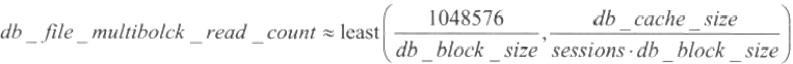 也可以让数据库引擎自动配置db_file_multiblock_read_count初始化参数的值。要使用这个特性,只需不设置它就可以了。如公式9-2所示,接下来数据库引擎就会尝试将其设置为一个能够允许1MB物理读的值。然而,不管怎样,如果缓冲区的大小与数据库支持的会话数量相比非常小,就会应用某种合理性检查以减小这个值。