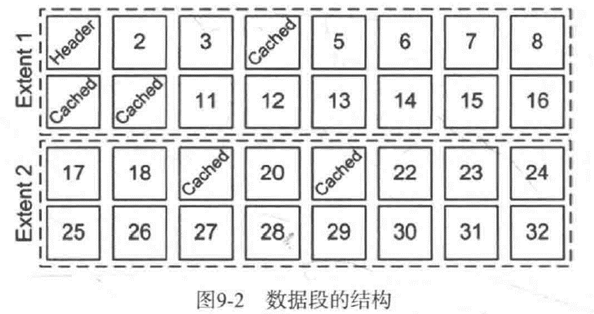 举例说明,图9-2展示了在使用手工段空间管理的表空间中存储的段的结构。与其他任何段一样,它由扩展组成(在本例中有2个),每一个扩展都是由块组成的(在本例中有16个)。第一个扩展的第一个块是段头。某些块(4、9、10、19和21)已经缓存在缓冲区中。为这个段执行缓冲读的数据库引擎进程无法执行任何的物理多块读,即使db_file_multiblock_read_count初始化参数设置为大于或等于32的值也不行。