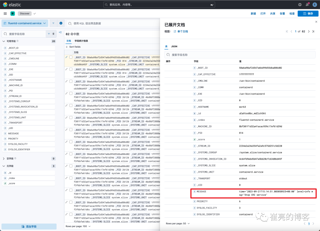 查看containerd服务日志,已成功解析了MESSAGE字段内容,并新增了@timestamp、leve、msg字段