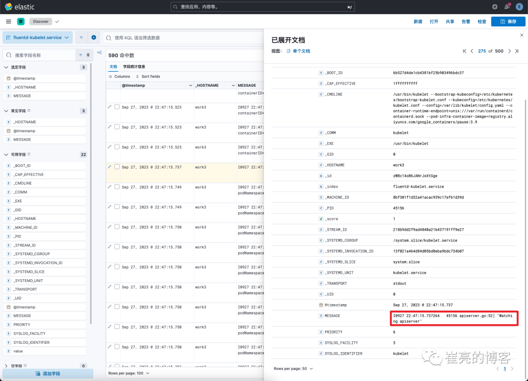 查看kubelet服务日志,同样成功解析了MESSAGE字段内容,并新增了@timestamp、class、message字段