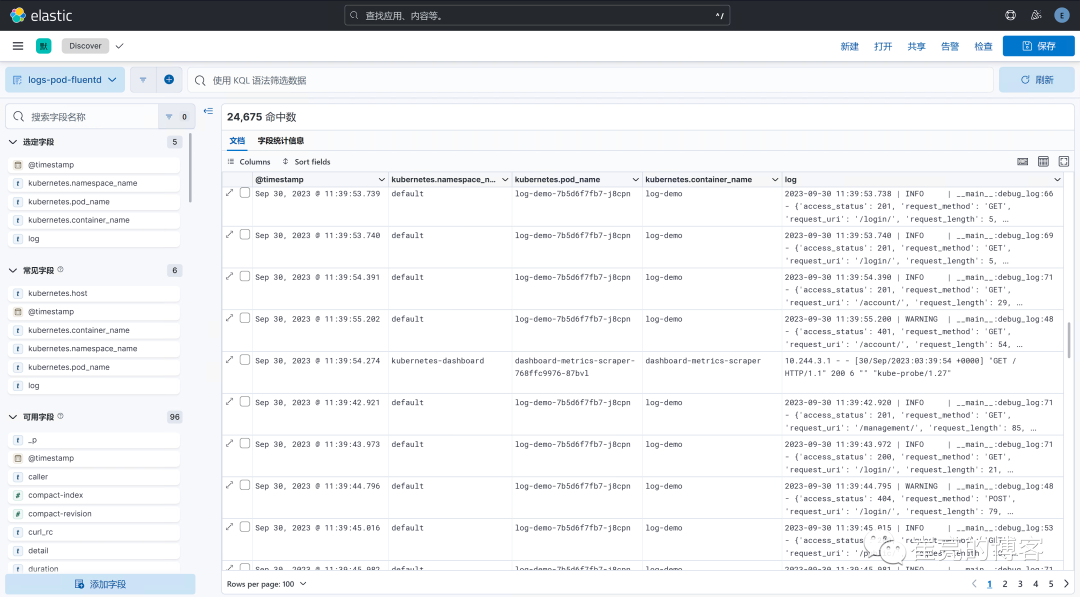 默认情况下,fluent bit会采集所有pod日志信息,并自动添加namespace、pod、container等信息,所有日志内容存储在log字段中。