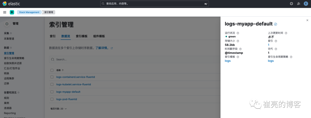 查看kibana索引信息,已成功创建名为logs-myapp-default的数据流。