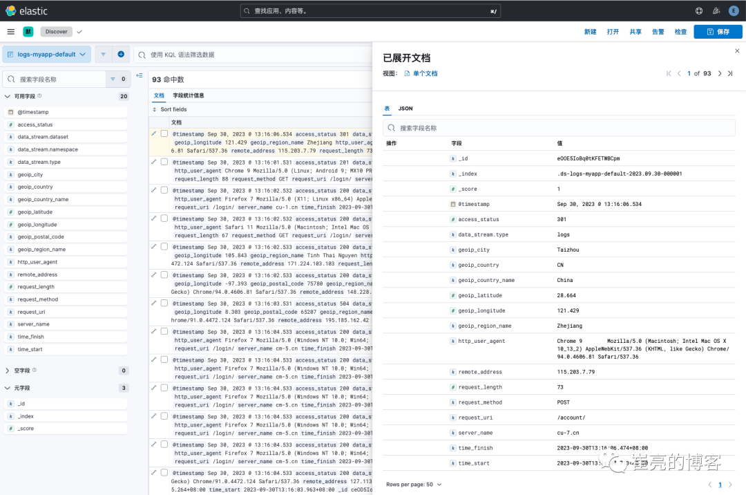 查看logs-myapp-default字段信息,已成功解析了日志内容。
