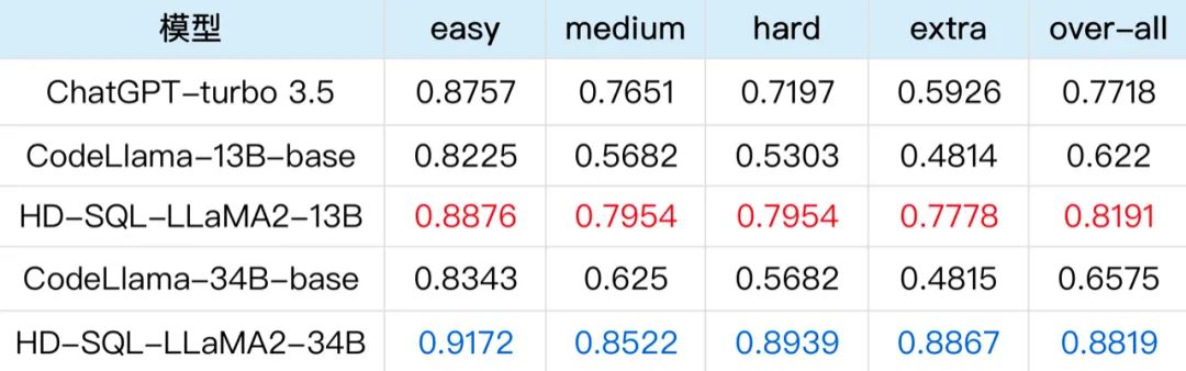 为了验证生成SQL的正确性,团队针对每个评估样本构造了一个由若干数据表构成的数据库,每张数据表都包含若干条数据记录。对于每个评估样本,分别执行Ground-Truth SQL和生成的SQL,通过检验生成SQL的可执行度和比对查询结果的一致性,判断生成SQL的正确性,最终统计整个评估集的准确率。评估结果显示,HD-SQL-LLaMA2在不同难度的评估样本集上均表现良好,13B模型准确率接近82%,34B模型准确率超过88%,展现了该模型强大的零样本泛化能力和商业化应用潜力。