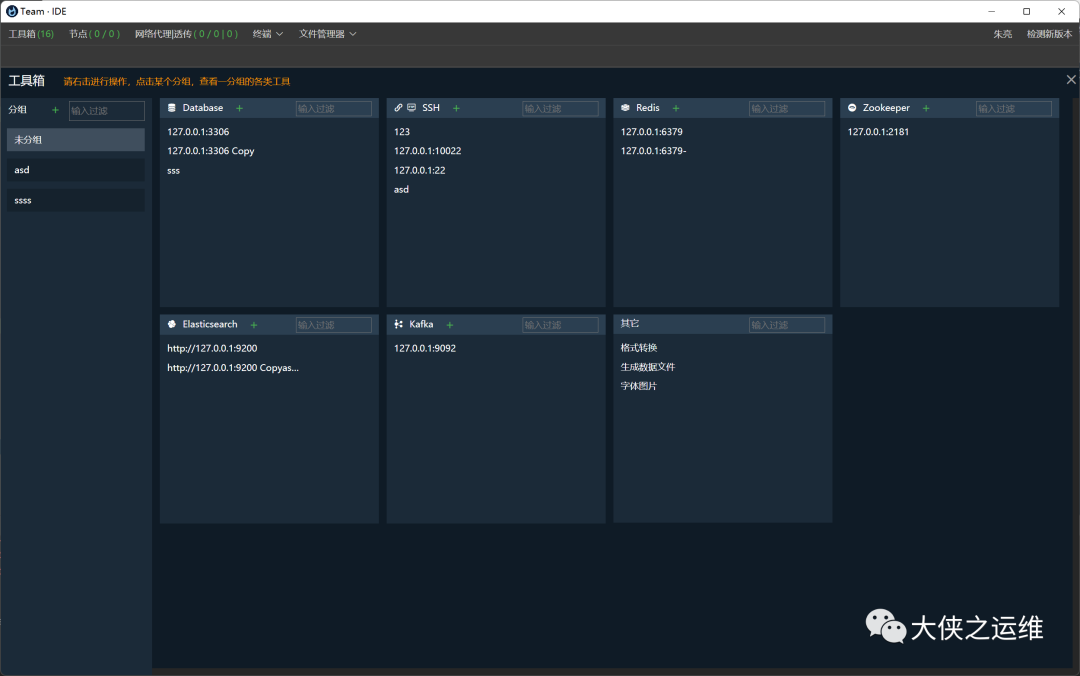 这是一款集合了ssh、sftp、kafka、zookeeper、elasticsearch、数据库等的管理工具,常用的中间件基本都覆盖了,作者是国内的,目前已经开源,纯go语言完成。