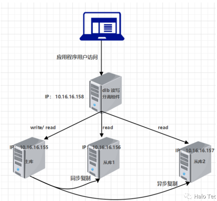 读写分离实现方式:应用程序通过在连接halo应用中配置主库与从库等地址,dlb会自动将读请求发送给从库,将写请求发送给主库,此外,halo的dlb驱动还能够实现多个从库的负载均衡。