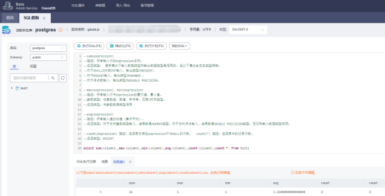 select sum(column1),max(column1),min(column1),avg(column1),count(column1),count(*) from test1
