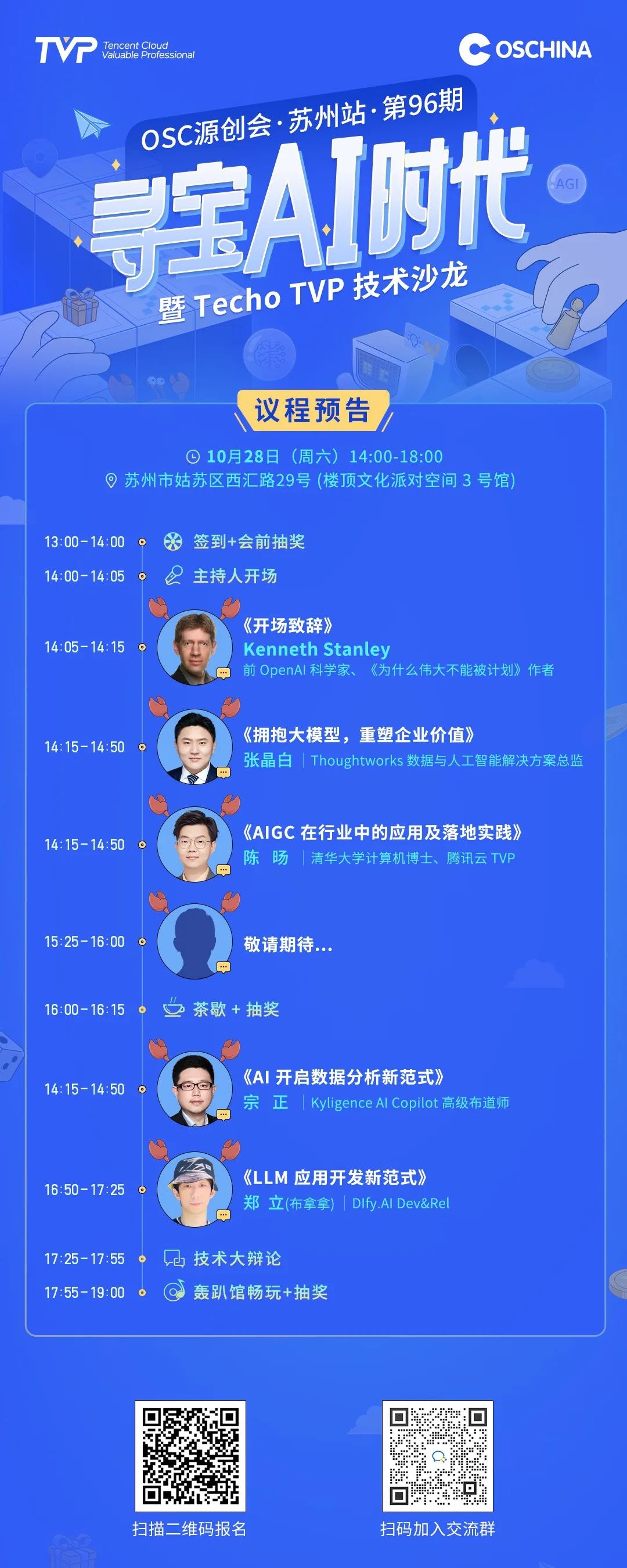 OSC 源创会本次以“寻宝 AI 时代”为主题,广邀业界各知名产品、团队的技术大佬,从大模型、开发工具、AI 实践等多个角度,分享自己的技术故事、成果、经验,以期为更多开发者们展示当下 AI 世界的各种新玩法。