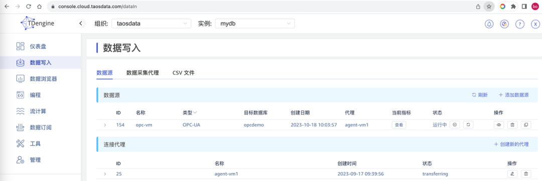 登录 TDengine Cloud 后进入控制台,点击数据写入->数据源->创建新的代理