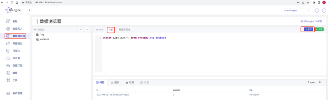 登入控制台,点击数据浏览器->Sql,执行多次最新数据查询语句,观察查询结果。如结果行时间戳单调递增,则表示数据采集链路工作正常,数据已正常入库了。