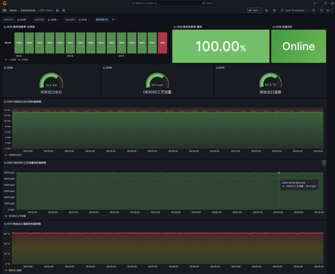 以上以制丝车间的几个典型参数为例,介绍了如何利用 TDengine 的 OPC 连接器,将数据采集入库,并通过 Grafana 将这些参数以动态可视化方式直观地呈现出来。