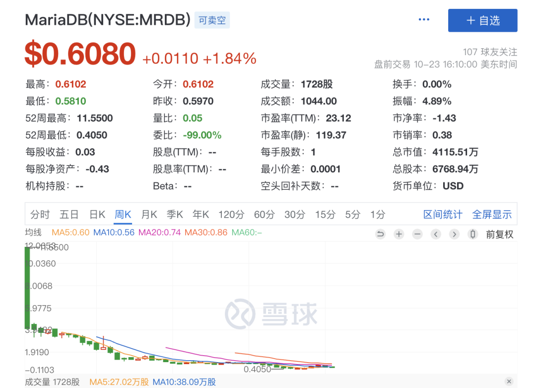 去年12月,MariaDB借壳SPAC成功在纽约证券交易所上市,股价一度达到11.55美元,市值一直接近8亿美元。谁曾想,一年不到,MariaDB股价不断坍塌下滑,如今股价仅仅只有0.6美元,市值只有4000多万,濒临退市。
