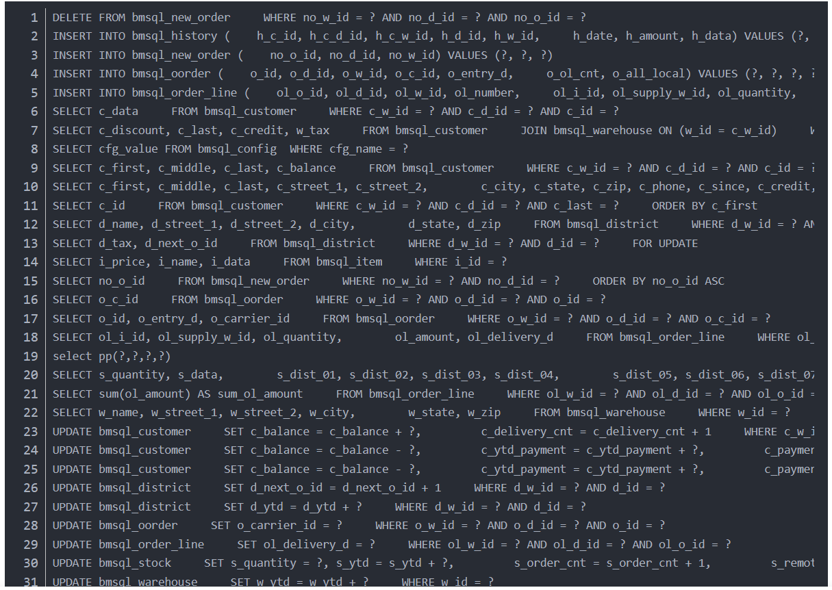 设置虚谷数据库的 reg_command = true,又 tpcc 涉及到 增删改查 合计 31 种类型的语句