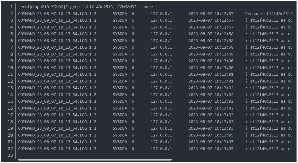 1 2 SYSDBA 6 127.0.0.1 2023-08-07 10:12:57 ? st12f40c2513 as cursor cur12f40c25236 return 15 {PN=3,GN=1 }