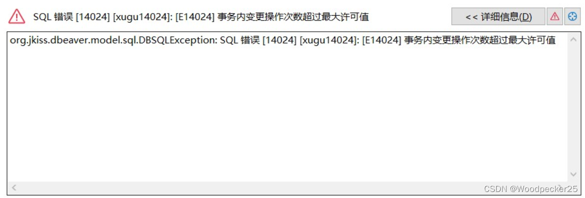 org.jkiss.dbeaver.model.sql.DBSQLException: SQL 错误 [14024] [xugu14024]: [E14024 L3 C2] 事务内变更操作次数超过最大许可值10000,可通过系统参数max_trans_modify适当调整限制