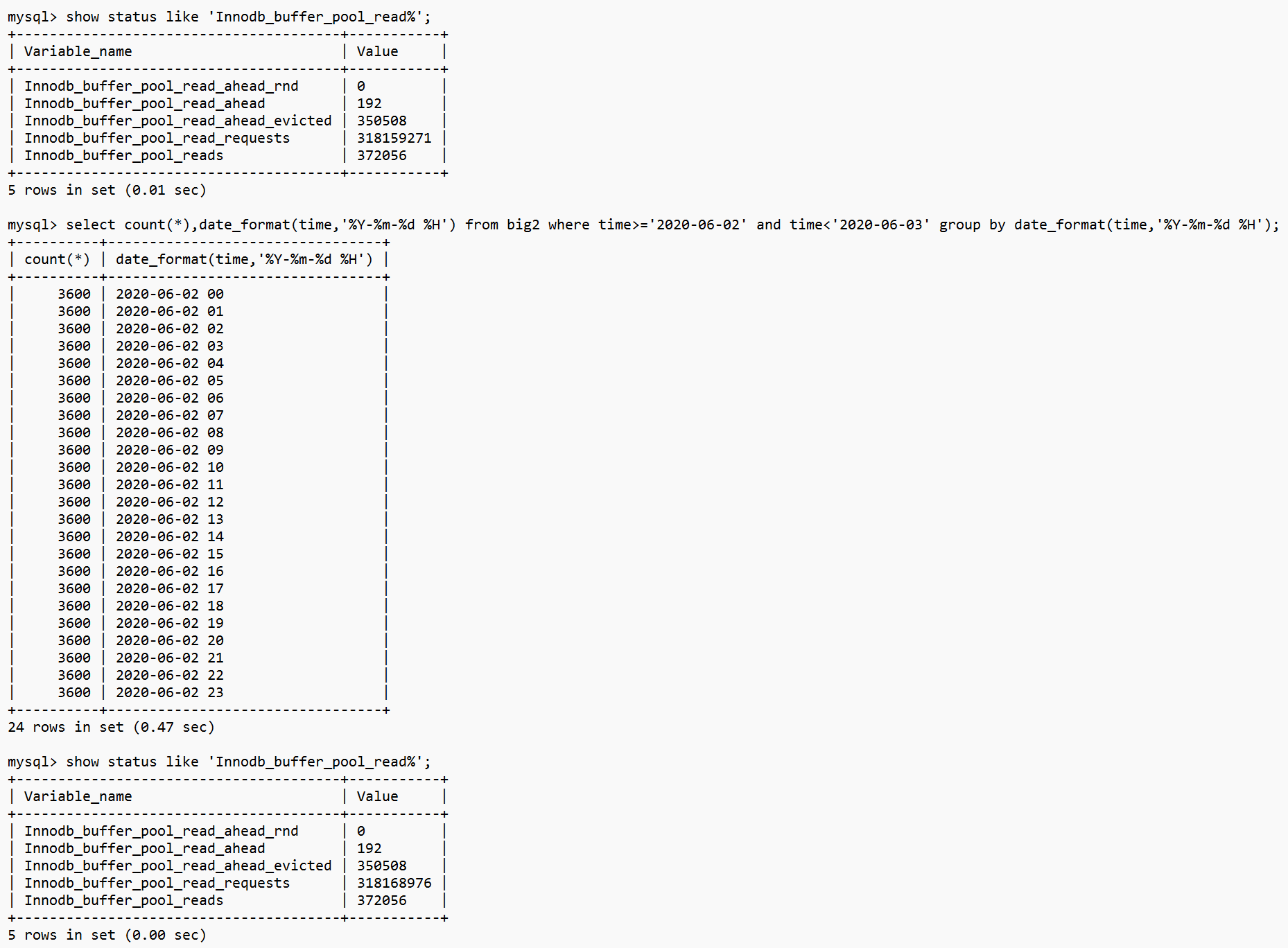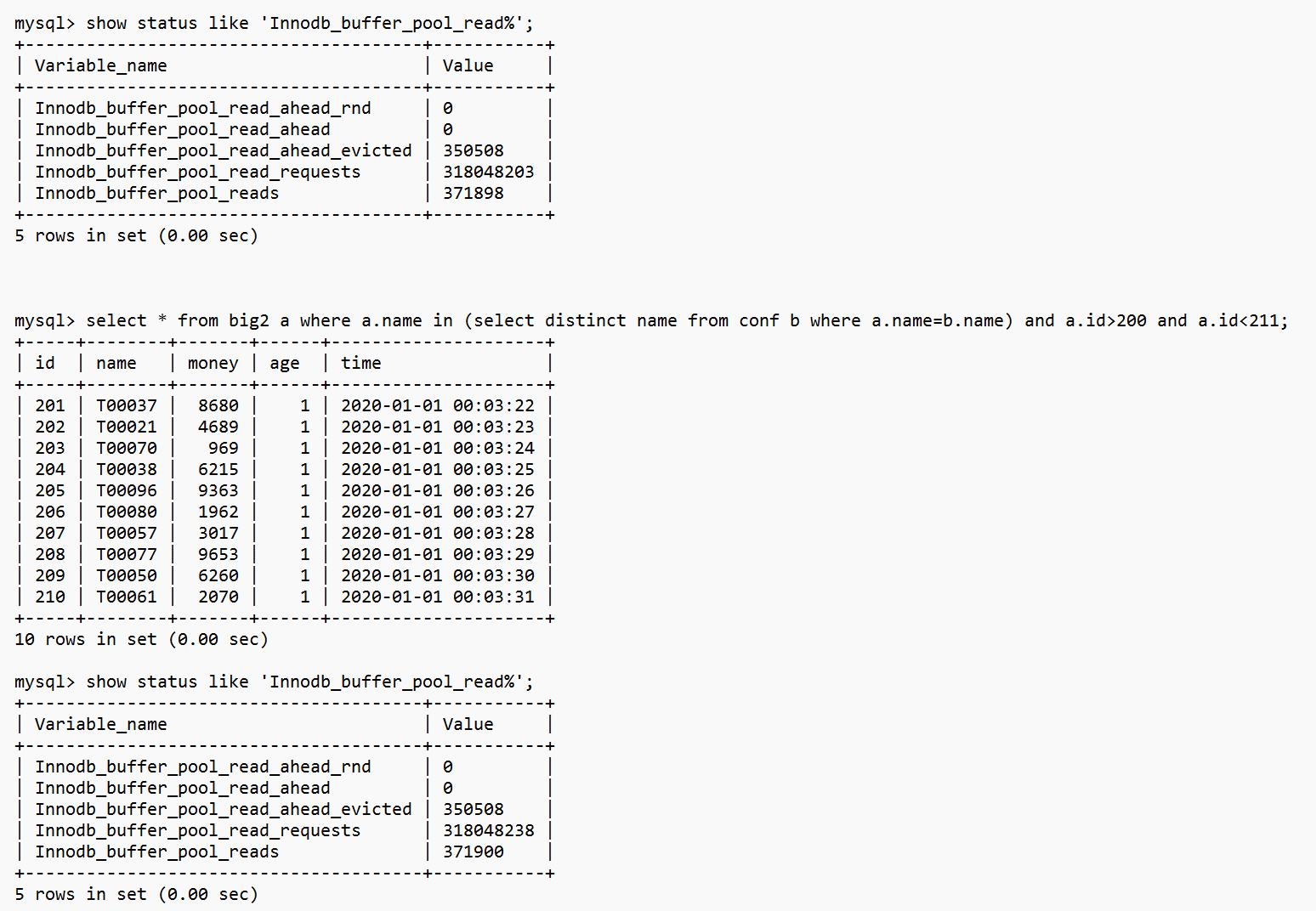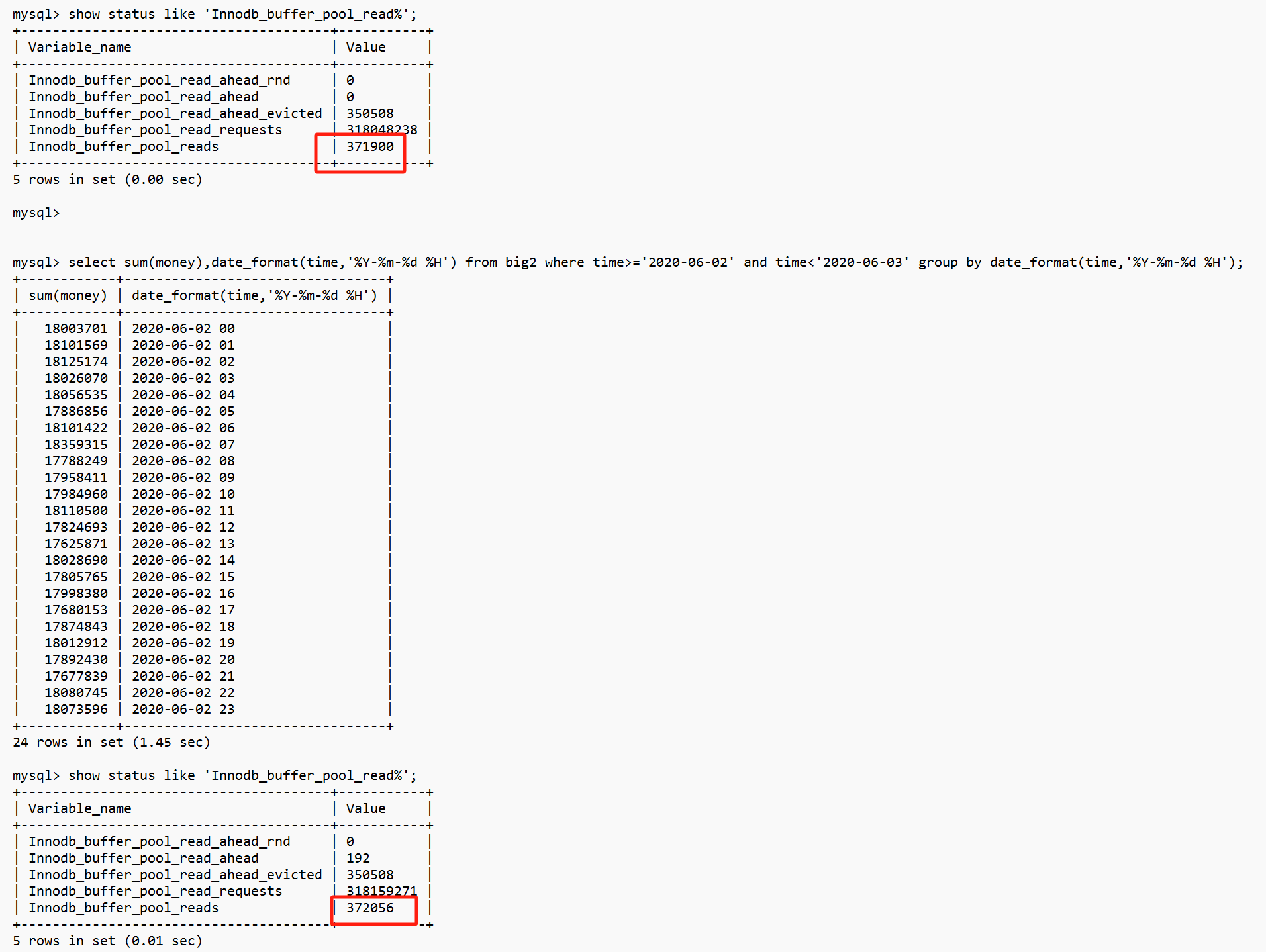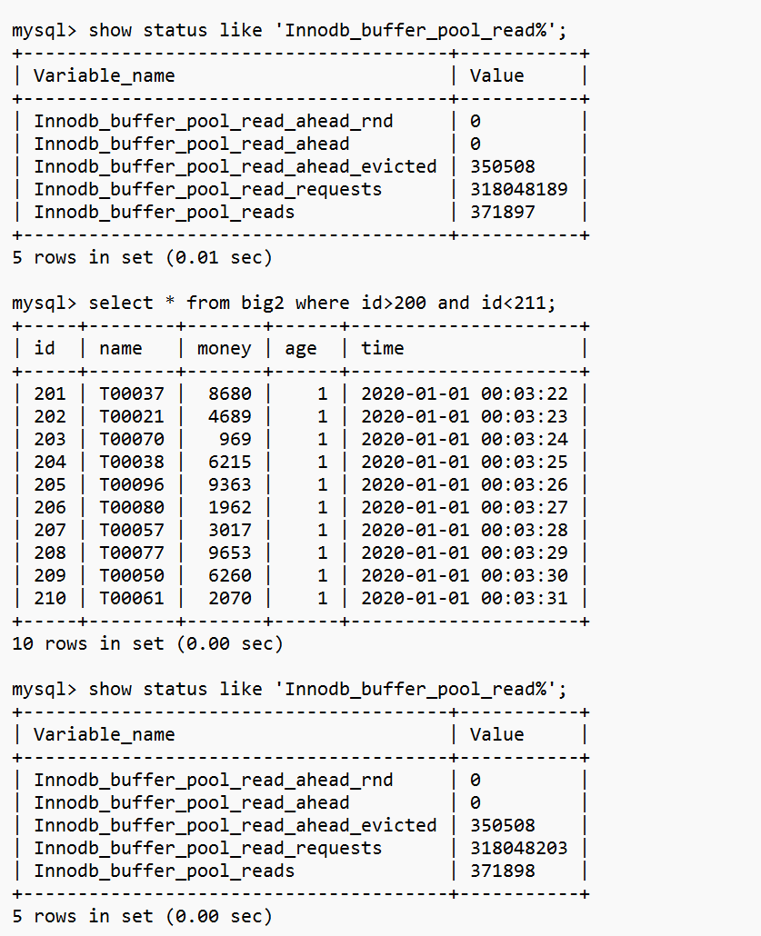 Innodb_buffer_pool_reads这个值增加了1,说明读取了一次IO,大约16K。