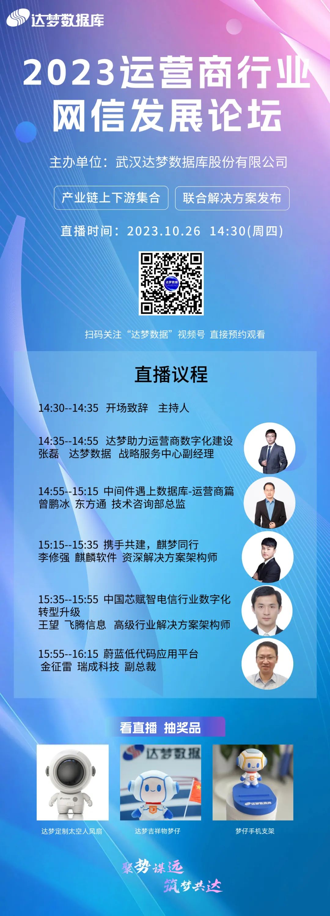 运营商行业作为关乎国家安全和国计民生的重要行业,是我国信息化程度和信息化技术最高的行业之一,属于技术密集型产业,信息技术应用创新的推广应用,成为推进运营商行业更高质量发展的驱动力。2021年11月《“十四五”信息通信行业发展规划》明确提出,到2025年基本建成高速泛在、集成互联、智能绿色、安全、可靠的新型数字基础设施体系。目前,中国移动、中国电信、中国联通等运营商已逐步拉开行业信创帷幕,以保障信息系统供应链安全,提升端到端自主、可控、可替代能力,加速运营商行业自主创新进程。达梦作为国产数据库龙头企业积极投身于运营商行业信创发展浪潮中,目前达梦的全栈数据产品及解决方案已经成功运用到了三大运营商的管理域、业务域、网络运营域的多个核心系统中。为进一步推动运营商行业信创发展进程,达梦将于10月26日14:30线上开展“2023运营商行业网信发展论坛”直播活动,以运营商用户信创改造需求为出发点,携手软硬件生态上下游厂商,助力加速运营商行业信创落地进程。欢迎预约观看!
