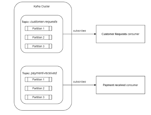 Kafka将事件存储在主题中。主题是数据的逻辑分割,如一个分类。例如:所有与客户请求相对应的事件可以保存在一个名为customer-requests的专用主题中,而所有与接收的付款相对应的事件可以保存在另一个名为payment-received的主题中。因此,如果你只想消费客户请求,那么你可以订阅customer-requests主题。这就像拥有多个消息队列,每个分类一个队列。