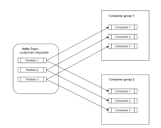 消费者订阅一个主题,然后它将开始从该主题接收数据。消费者可以在消费者组中定义(只是一个标签)。但是,使用这个消费者组对于扩展负载来说是一个关键点。消费者组与kafka主题之间的关系就像一个发布-订阅服务,其中订阅者是整个消费者组。