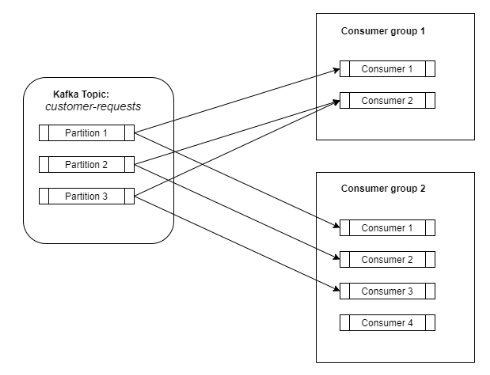 在这种情况下,我们如何扩展?就像我之前说的,主题中的数据被分割成多个分区,而消费者组由不同的消费者组成(它们可以是不同机器上的不同进程)。