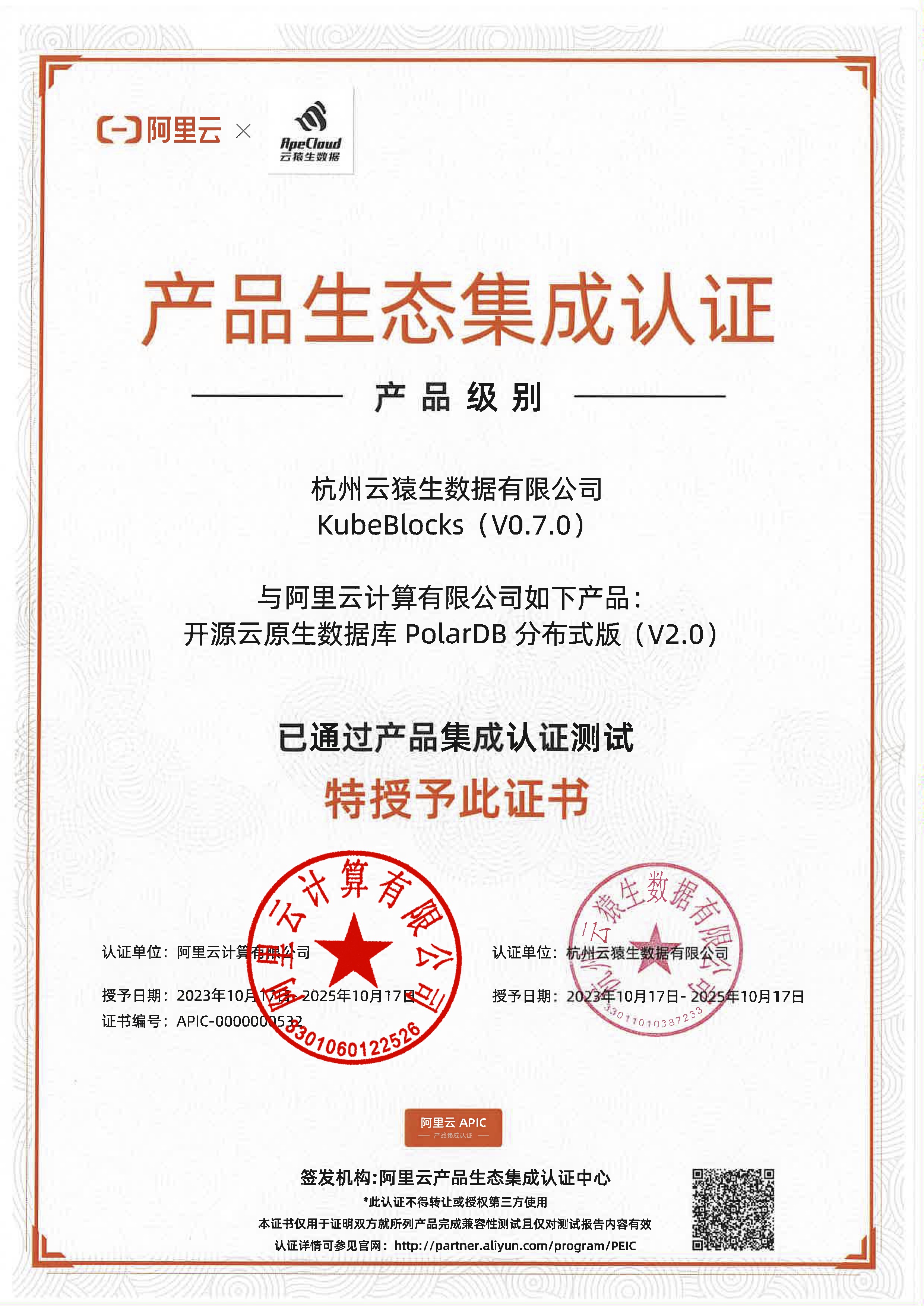 近日,杭州云猿生数据有限公司(以下简称云猿生)与阿里云PolarDB 开源数据库社区展开产品集成认证。测试结果表明,杭州云猿生数据有限公司旗下KubeBlocks(V0.7.0)与阿里云以下产品:开源云原生数据库PolarDB 分布式版( V2.0 ),完全满足产品兼容认证要求,兼容性良好,系统运行稳定。