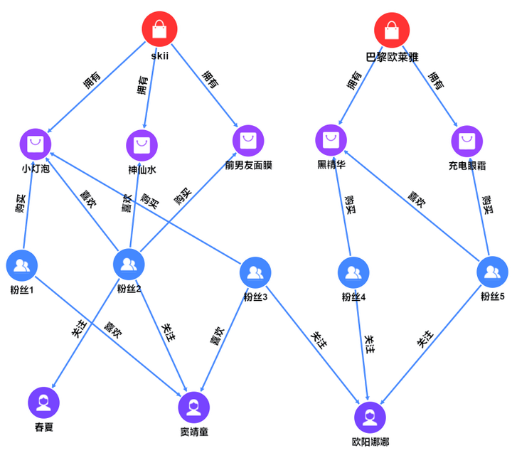 传统方法选择KOL,极端考验品牌方的眼力,依赖跟品牌调性一致的主观判断和容易注水的粉丝数据,非常难预计KOL的真实带货能力,品效无法合一。而依靠图技术,品牌方可以依据自己产品的用户圈层,倒推找到他们最信任的KOL。如图2所示,SK-II旗下护肤产品有小灯泡、神仙水、前男友面膜等,这些产品拥有各自的消费人群和粉丝群体,这些真实用户/粉丝人群共同关注的KOL,才是对品牌受众最具影响力的意见领袖。图技术在该场景的价值便在于——通过找到粉丝群体高度覆盖品牌真实受众的KOL,实现KOL社交营销的精准触达。