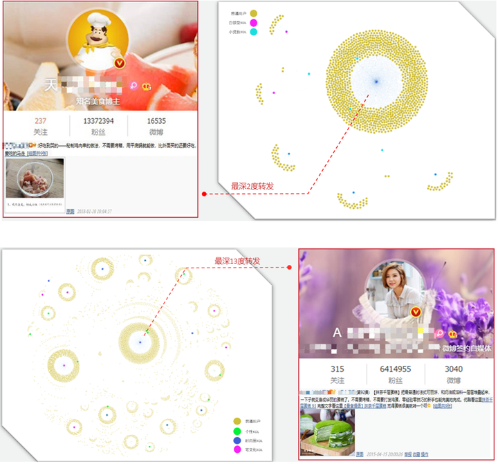 实际社交网络中用户的粉丝或关注数量可能很多,但这并不代表用户在社交网络的真实影响力也越大。如图3,微博大V“天某某”的1337万的粉丝数比“A某某”641万的粉丝数多了一倍,但就其发布的具体博文来看,该文的转发层级最多仅形成了2跳。也就是说,对于“天某某”发布的博文,我们能期待的最好结果不过是,其粉丝转发博文后,该粉丝的粉丝/好友继而也转发了该博文。相较之下,“A某某”关于抹茶蛋糕一文的转发层级却深达13度,触达了不同社群更多更广的用户。可见,粉丝数量和网络社交影响力并不对等,品牌方在寻找KOL时不能单靠粉丝数的表面数据评估KOL的社交影响力,更重要的是评估该KOL的社交关系质量——更高的社交关系质量,意味着更多的N跳转发机会,更多的真实曝光和更大的产品破圈的可能。