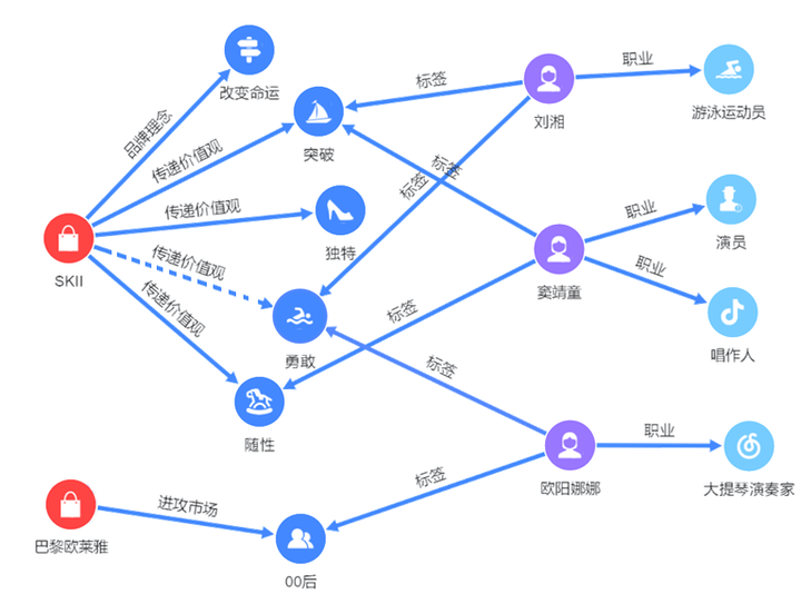 我们以知名护肤品牌SK-II为例,说明图数据库如何通过不同标签建立品牌与KOL之间的多维关联,进而迅速筛选与品牌契合的KOL。自2015年发布品牌活动#改写命运#以来,SK-II一直积极鼓励女性勇敢改变自己的命运,敢于将生命中的坎坷与挑战踩在脚下。如图1,我们可搭建品牌、品牌标签、KOL、KOL标签的品牌知识图谱。通过关联分析可以发现,“鬼马少女”窦靖童具备“突破”和“随性”的标签,与SK-II不断创新且坚持自我的品牌基因、#改写命运#的品牌理念,以及想要传递的诸多品牌价值观比较契合。相较之下,00后艺人欧阳娜娜给人的感觉更多以活泼、温暖、灵动为主,是“不设限的千禧一代”,与巴黎欧莱雅一直倡导的美不设限、美的多元化理念更吻合。