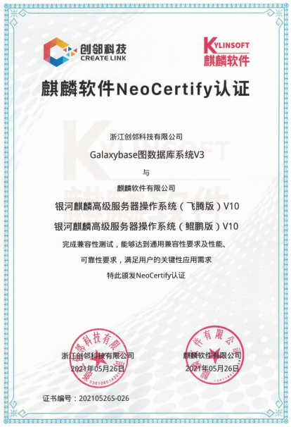 近日,浙江创邻科技有限公司(简称:创邻科技)自主研发的Galaxybase图数据库系统与麒麟软件有限公司(简称:麒麟软件)旗下银河麒麟高级服务器操作系统V10(飞腾版、鲲鹏版)完成兼容性测试。经双方人员共同测试,Galaxybase 能够达到通用兼容性要求及性能、可靠性要求,能满足用户的关键性应用需求。