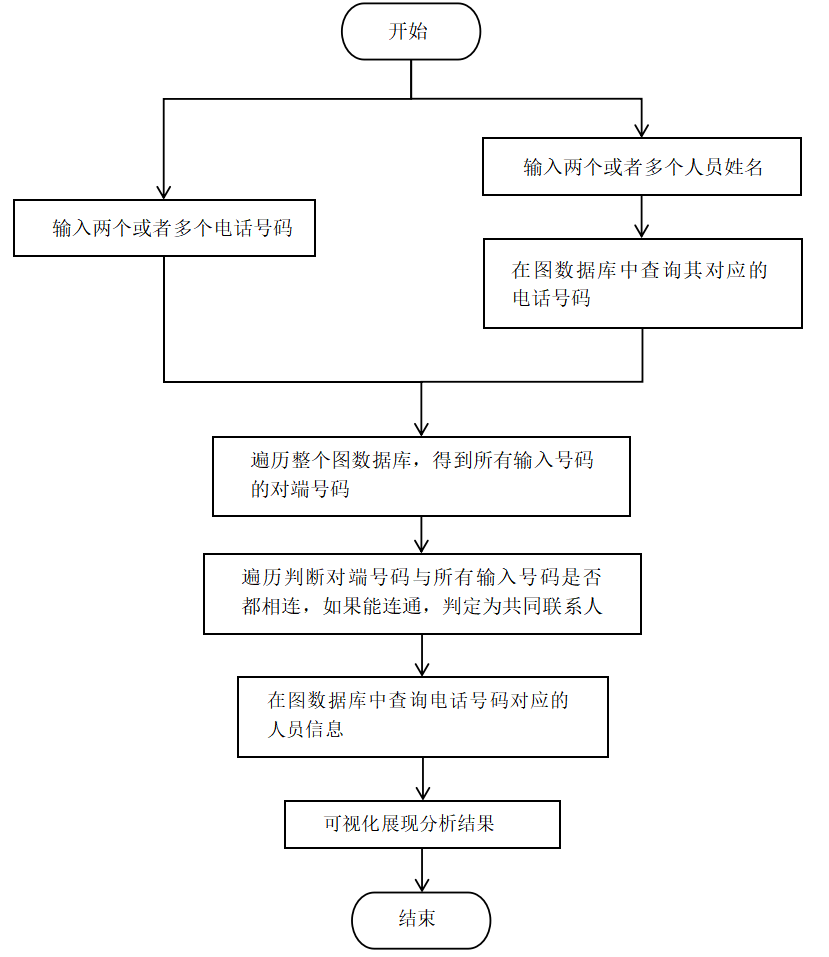 共同联系人分析功能主要用于寻找多个号码之间的共同联系人,可以是两个号码之间,也可以是多个号码之间。该功能可以支撑很多应用,例如找出通话的共同目标,为办案提供更多线索;在传染病防御方面快速找到可能与确诊病人或疑似病人有密切接触的人员。共同联系人分析的方法流程图如下图所示。