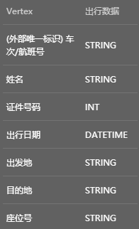 | 出行数据 | 外部唯一标识(车次/航班号)、姓名、证件号码、出行日期、出发地、目的地、座位号 |