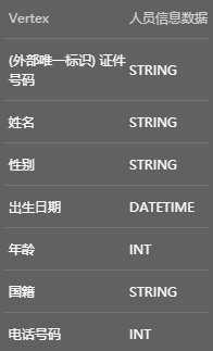 | 人员信息数据 | 外部唯一标识(证件号码)、姓名、性别、出生日期、年龄、国籍、电话号码 |