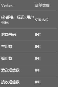 | 话单数据 | 外部唯一标识(用户号码)、对端号码、主叫数、被叫数、发送短信数、接收短信数 |