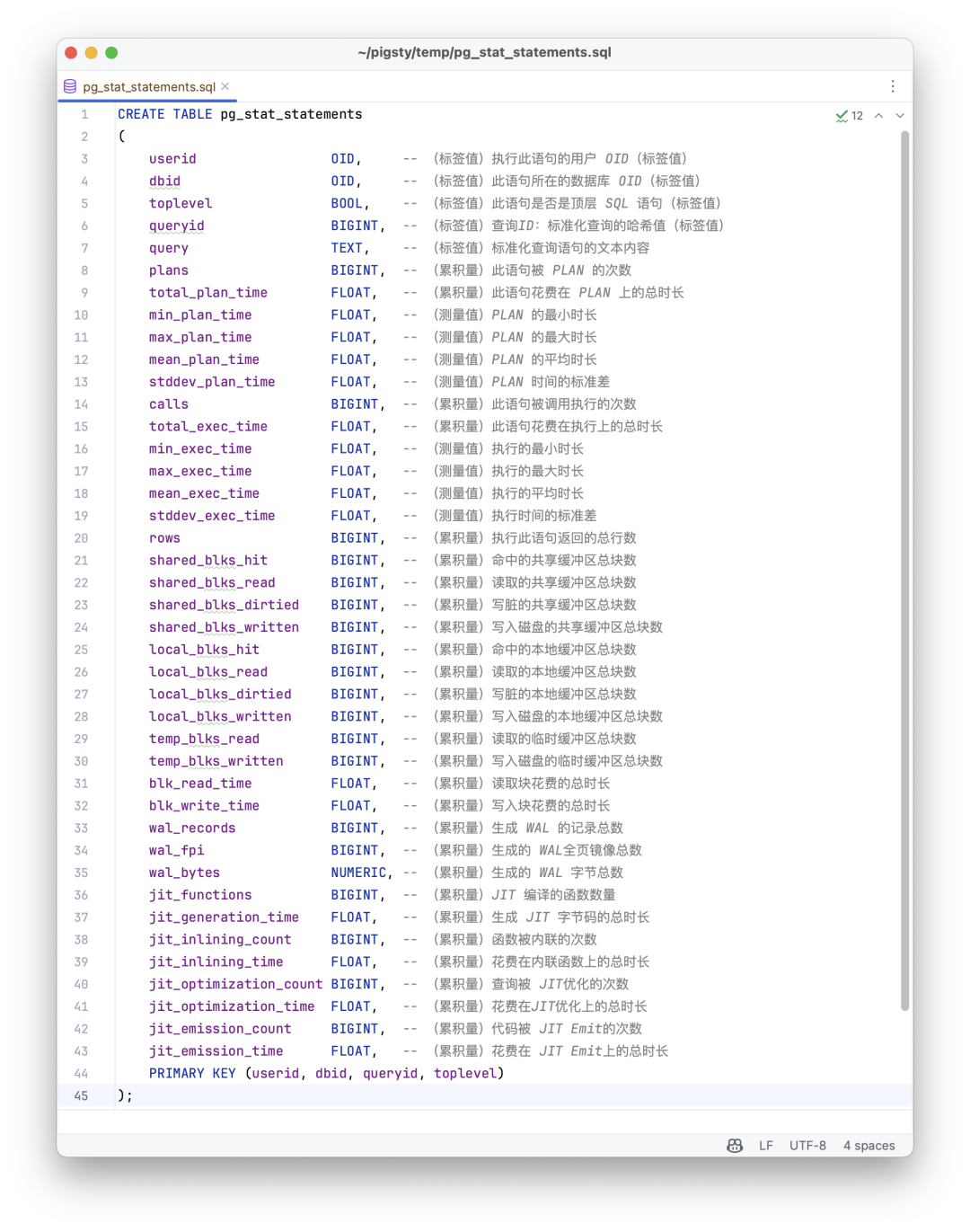 在 PGSS 中,系统中的每一类查询(即抽取变量后,执行计划相同的查询)都会被分配一个查询ID,紧接着是调用次数,执行总耗时,以及各种其他指标,其完整模式定义如下(PG15+):